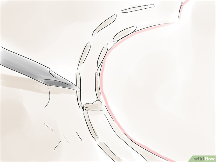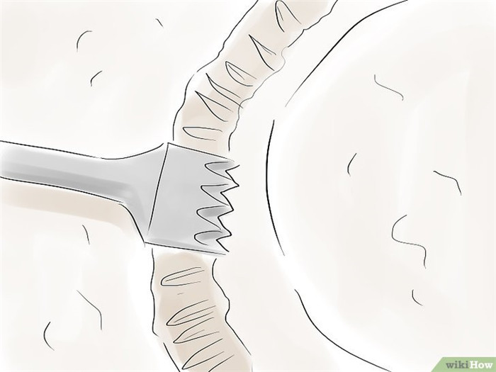7.将尖头的凿子以45度角嵌入一条小槽。然后用最大的锤子敲打凿子。
