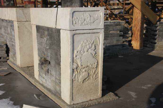 墙面的磨砖对缝品质很好,正房前廊两侧脚子墙迎风石采用汉白玉的浮雕,中部有龙和麒麟的高浮雕,上部有花卉和“琴、棋、书、画”等图案。柱下有鼓形的汉白玉柱础,木柱直径为30厘米,上部有透雕燕尾,接柁上有吉祥图案的木刻。