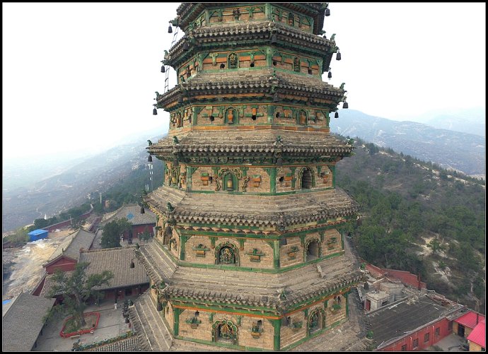 飞虹塔位于山西洪洞县广胜寺,平面八边形,是有十三檐的楼阁式佛塔,高47.6米。塔身全部为砖砌,底层周设回廊,南面入口处凸出双层龟须座一间,与上边的木质塔不一样的是它的外型是硫璃包镶,十字歇山顶,建造精致,比例和谐,犹如一座小型楼阁。