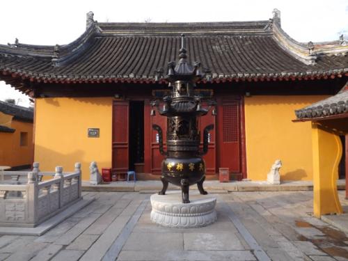 山门正前,建有照壁:壁面金黄,壁顶青瓦;上题六字,南无阿弥陀佛。山门厅内,石狮一对,分列左右,在殿正前,摆放着一个宝鼎:最底层是滚圆三足;上两层则是鼎檐六角。在石雕香炉的左侧,则有放生池。放生池内,摆放滴水观音。另外我们绕过香炉,便是大雄殿了。